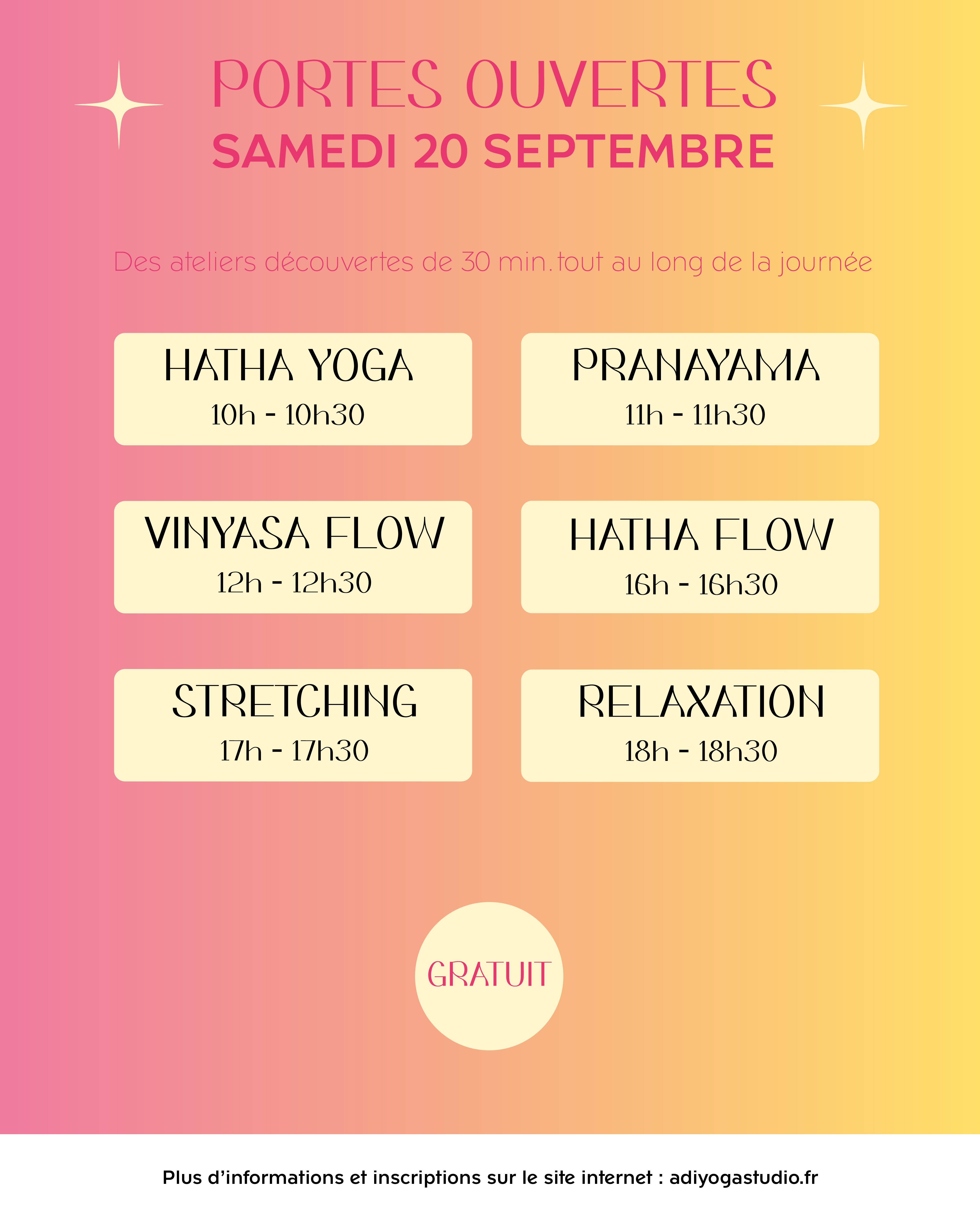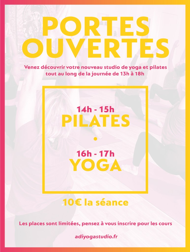 Nous avons le plaisir de vous inviter à nos journées portes ouvertes qui auront lieu au studio Adiyoga. Venez découvrir notre univers dédié au bien-être et à la pratique du yoga le 19 octobre de 10h à 18h.